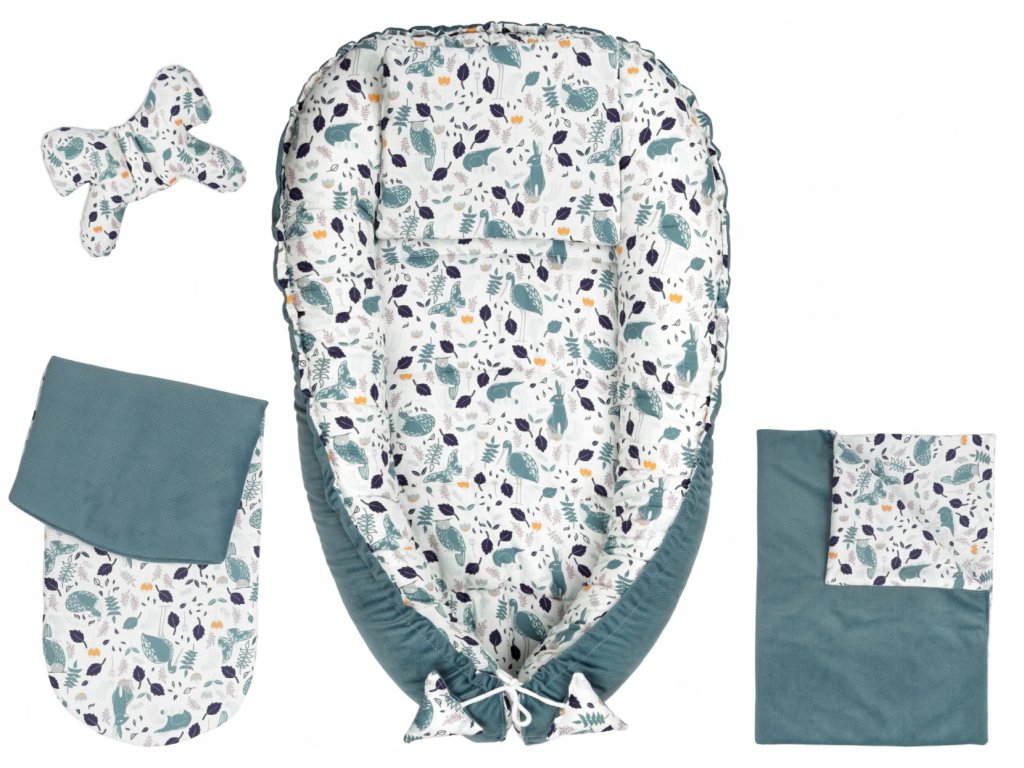 Kényelmes szett, amely tartalmaz egy megfordítható fészket a babának, két párnát (1x pillangó, 1x lapos), egy megfordítható takarót és egy megfordítható babakocsi párnát.